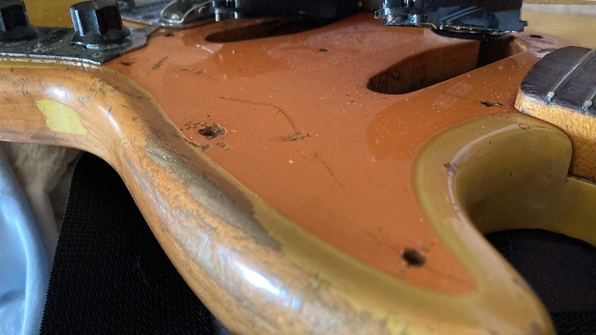 -the forearm contour was actually sanded down, my guess is the paint was chipping there and the owner went for comfort over style, or maybe they didn’t like the stripe, or backed out in the middle of a full refin. Kinda wish at least some of the stripe was still present on the front but I’m not touching the finish.